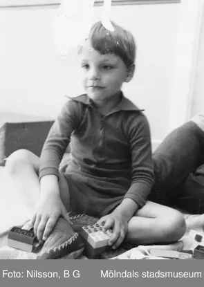 En sittande pojke som leker med Duplo. Holtermanska daghemmet, okänt årtal.