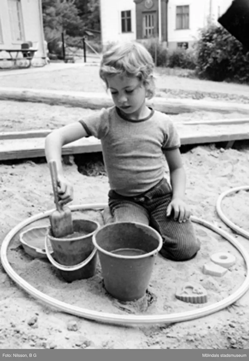 En pojke som leker i sandlådan. Holtermanska daghemmet 1973.