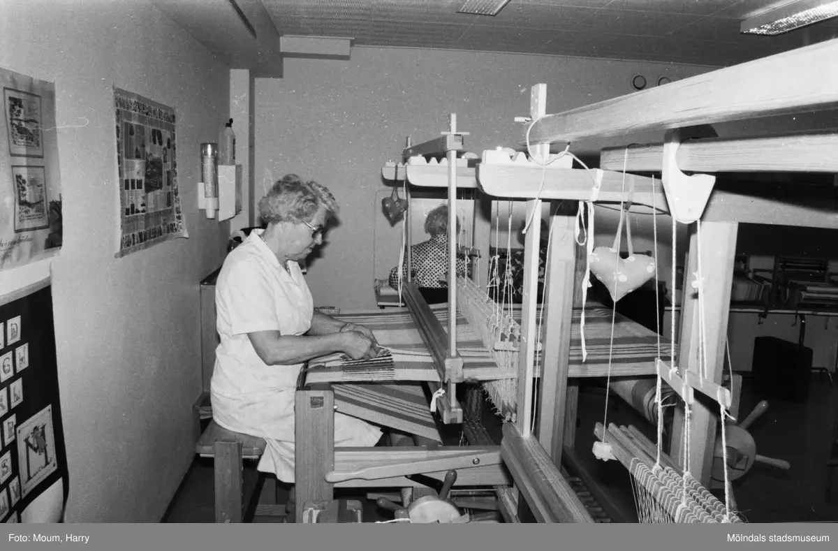 Pensionärsverksamheten kallad "Hobbyn" vid Våmmedalsvägen i Kållered, år 1983. "Olga Magnusson älskar att sitta vid vävstolen."