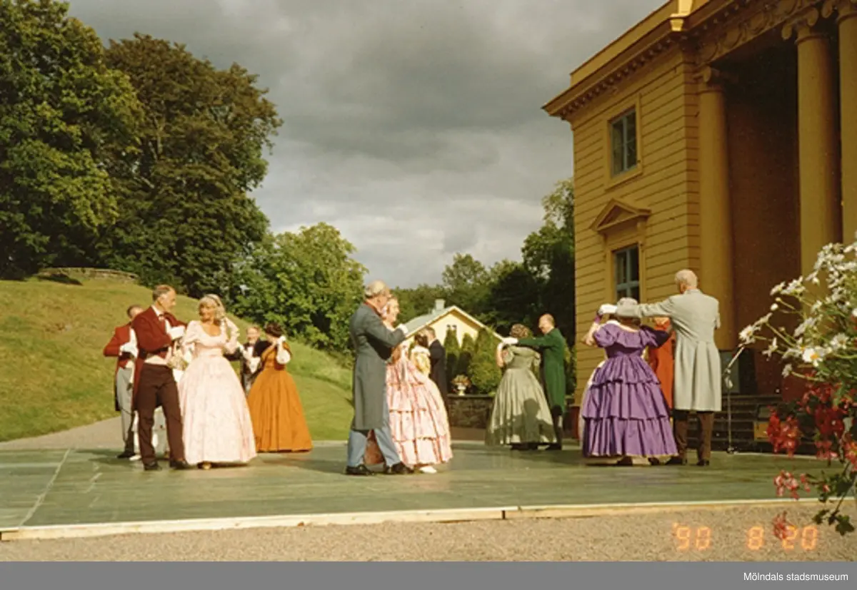 Dansuppvisning framför Gunnebo slott, med dansare i kläder från 1800-talets förra del. 20 augusti 1990.