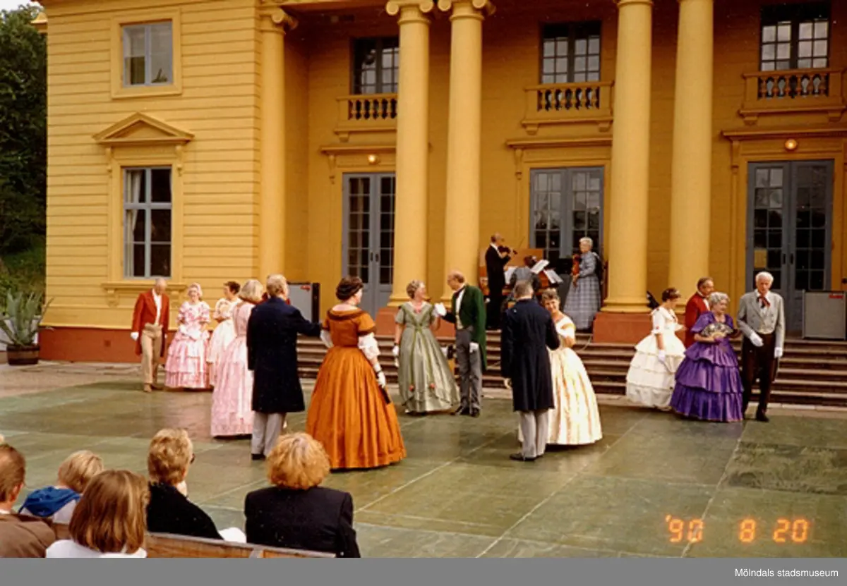Dansuppvisning framför Gunnebo slott, med dansare i kläder från 1800-talets förra del. 20 augusti 1990. Fler relaterande bilder finns.