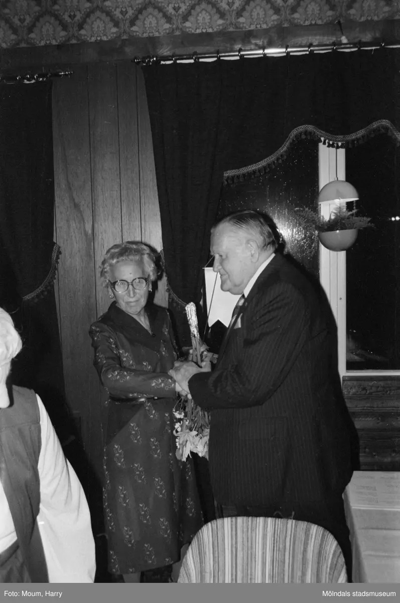 Kållered PRO firar 10-årsjubileum på Kållereds Värdshus, år 1983. "Ordföranden Sigrid Börjesson fick mottaga många hyllningar. Här av distriktsordförande Gustav Arvidsson."