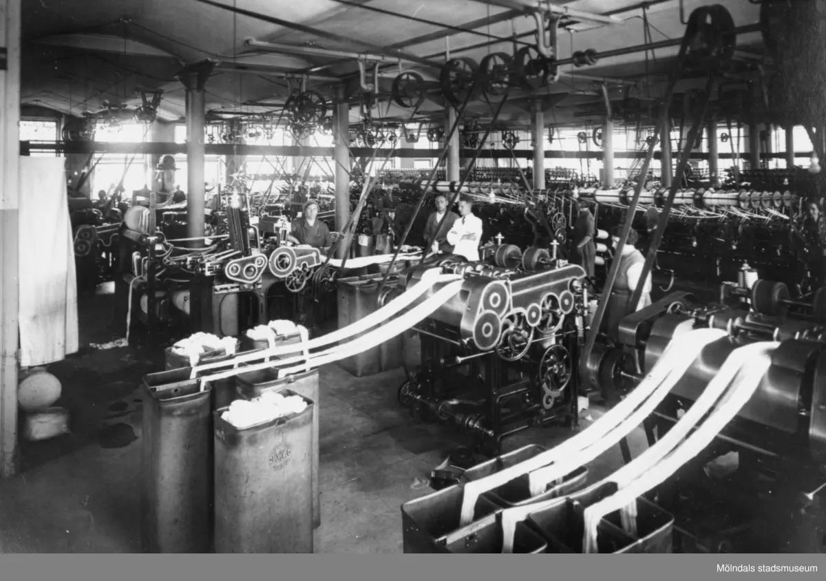 Interiör i Mölnlycke fabriker, Krokslätt. Några personer övervakar maskinerna. Årtal okänt.