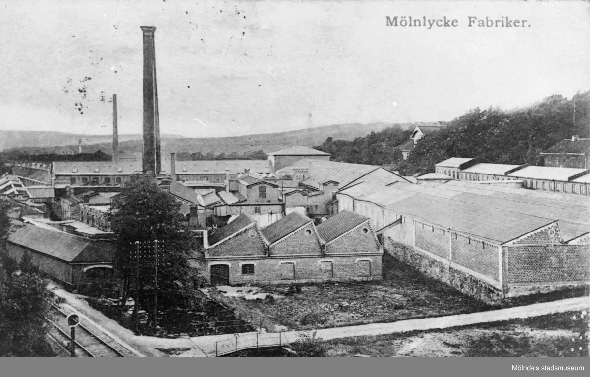 Ett vykort med utsikt över Krokslätts fabriker och angränsande område, cirka 1908.