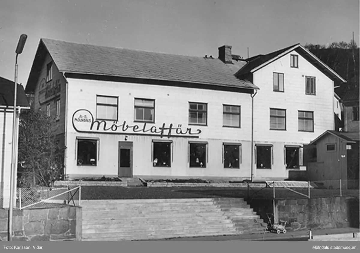Vykort på Trädgårdsgatan 3, Mölndals möbelaffär, sedd från Kvarnbygatan.
