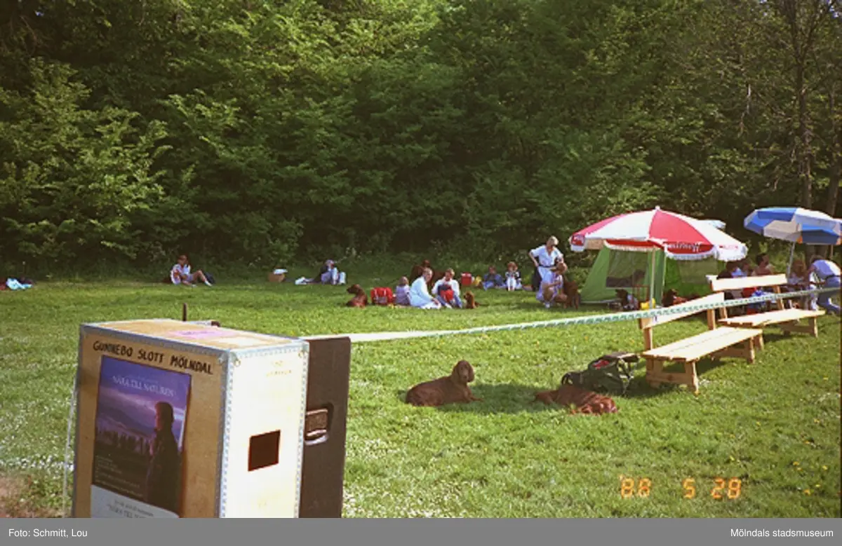 Några hundar och människor som ligger eller sitter i gräset. Man ser också parasoll, bänkar samt ett tält. Dagen till ära är det hunddressyr.