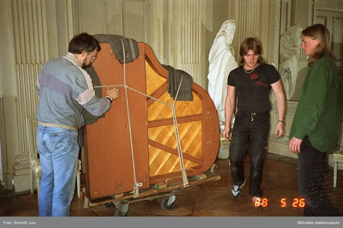 Tre män som flyttar en flygel inne på Gunnebo slott.
