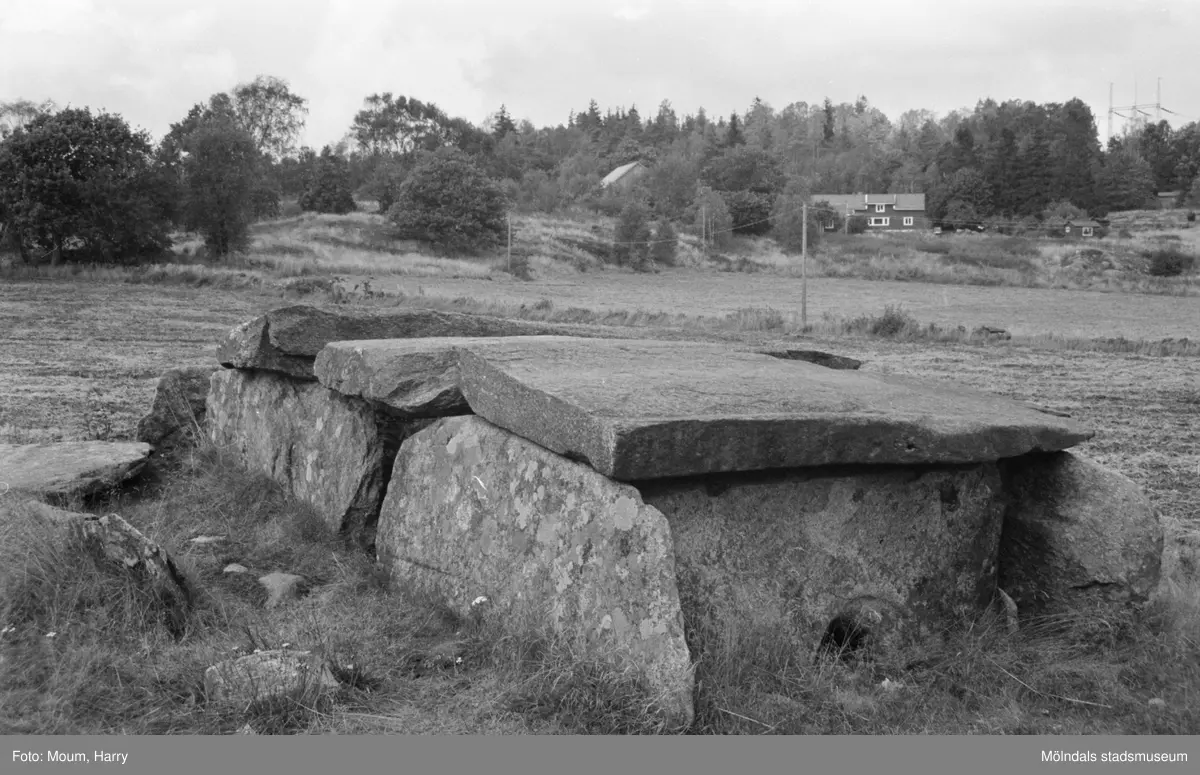 Titel: Hällkistan "Dvärgahuset" vid Norra Hällesåkersvägen i Dvärred, Lindome, år 1983. För mer information om bilden se under tilläggsinformation.
