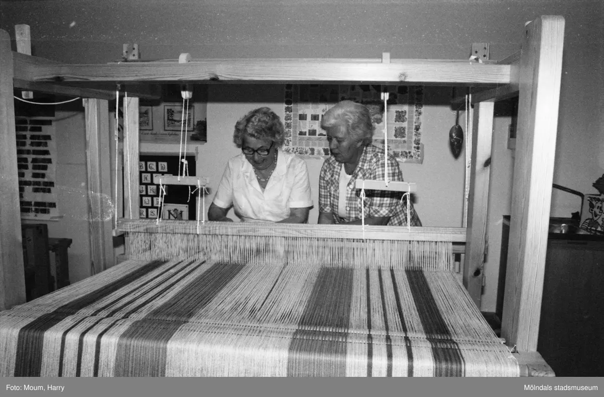 Pensionärsverksamheten kallad "Hobbyn" vid Våmmedalsvägen i Kållered, år 1983. Två kvinnor sitter och väver.