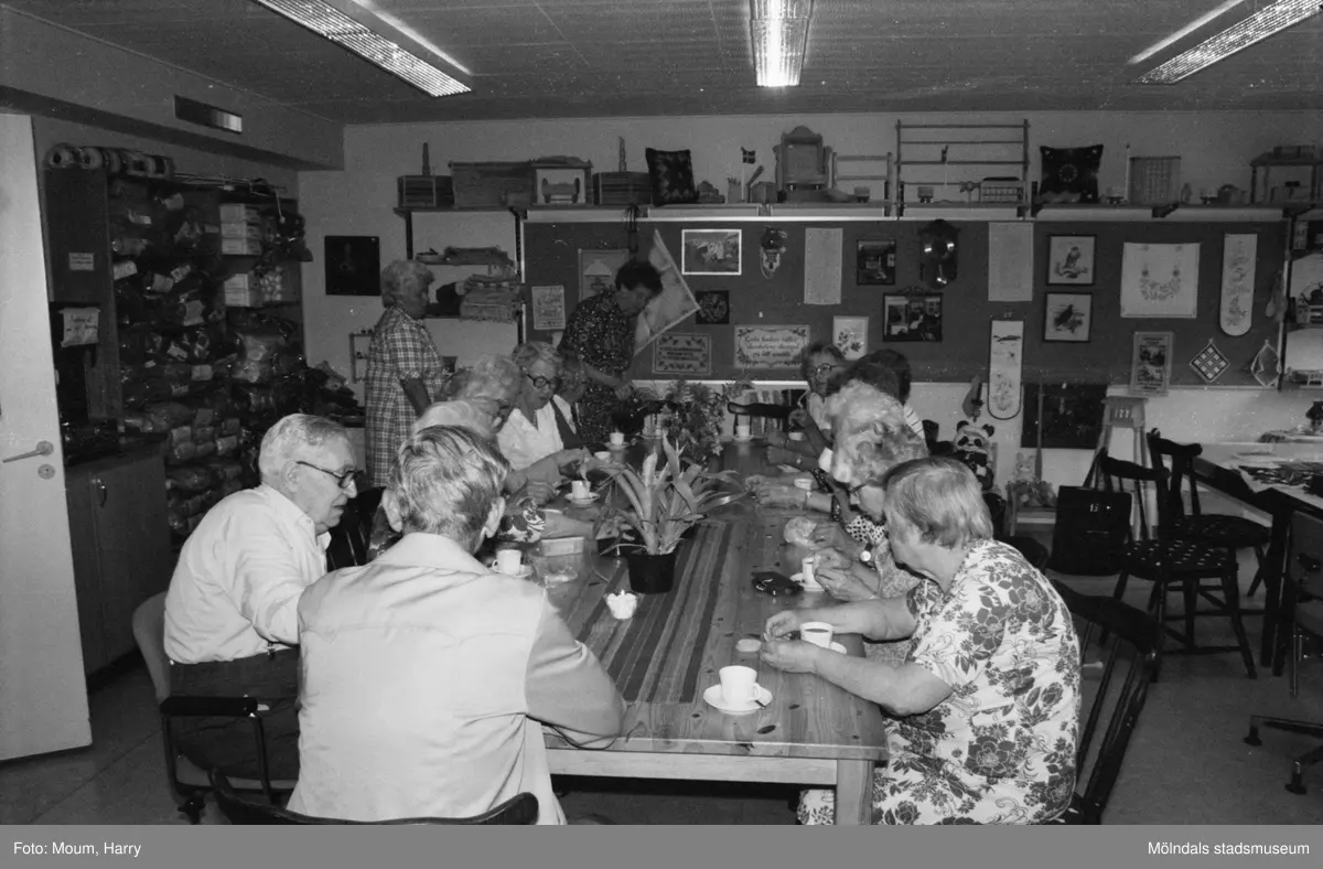 Pensionärsverksamheten kallad "Hobbyn" vid Våmmedalsvägen i Kållered, år 1983. Kvinnor och män sitter och fikar.