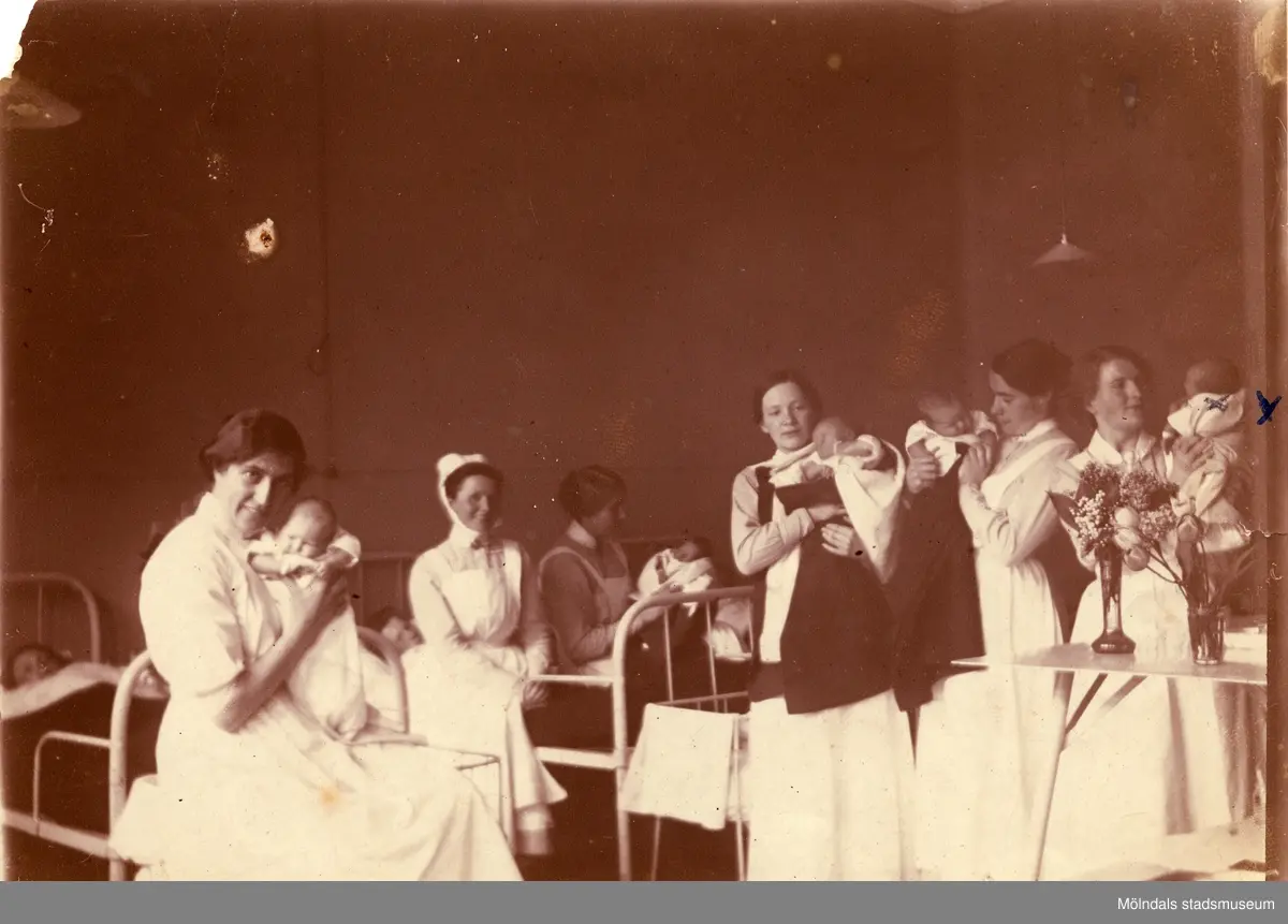 Fotografi från BB på Sprängkullsgatan i Göteborg, år 1916. Nyfödda Elna Börjesson (gift Kristoffersson) syns längst till höger. Modern Hilda Börjesson är skymd.