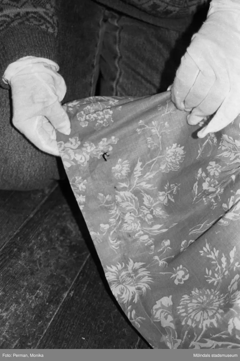 Antikvarisk storstädning på Gunnebo slott 1992. En person med vita skyddshandskar visar upp ett hörn av ett tygstycke.