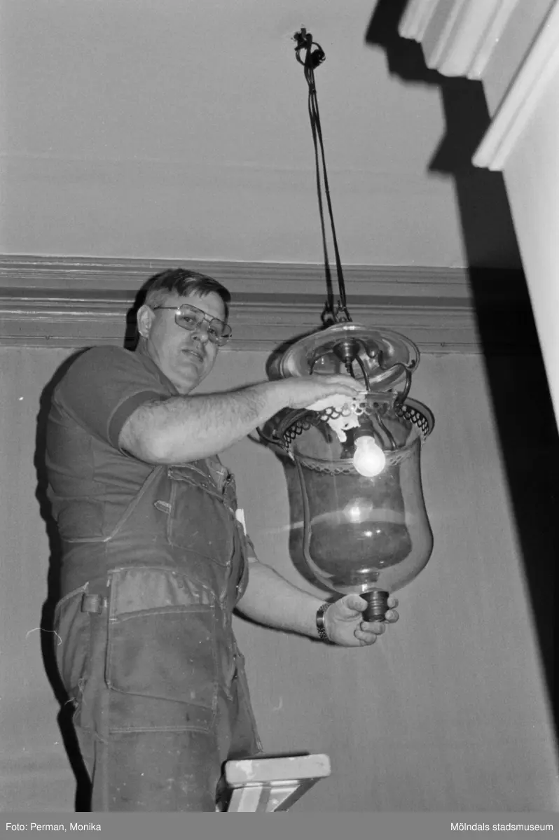 Antikvarisk storstädning på Gunnebo slott 1992. Tekniker Alf Garthman står på en stege och håller en taklampa i händerna.