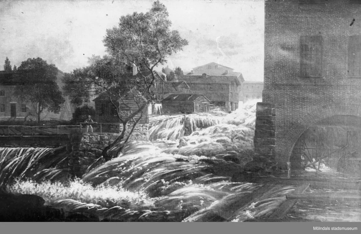 Längs upp på bilden ses taket till Rosenbergs fabrik (Kvarnfallet 14). Till höger ses stenfoten till Stora Götafors (Kvarnfallet 22-23, Götaforsliden 13).