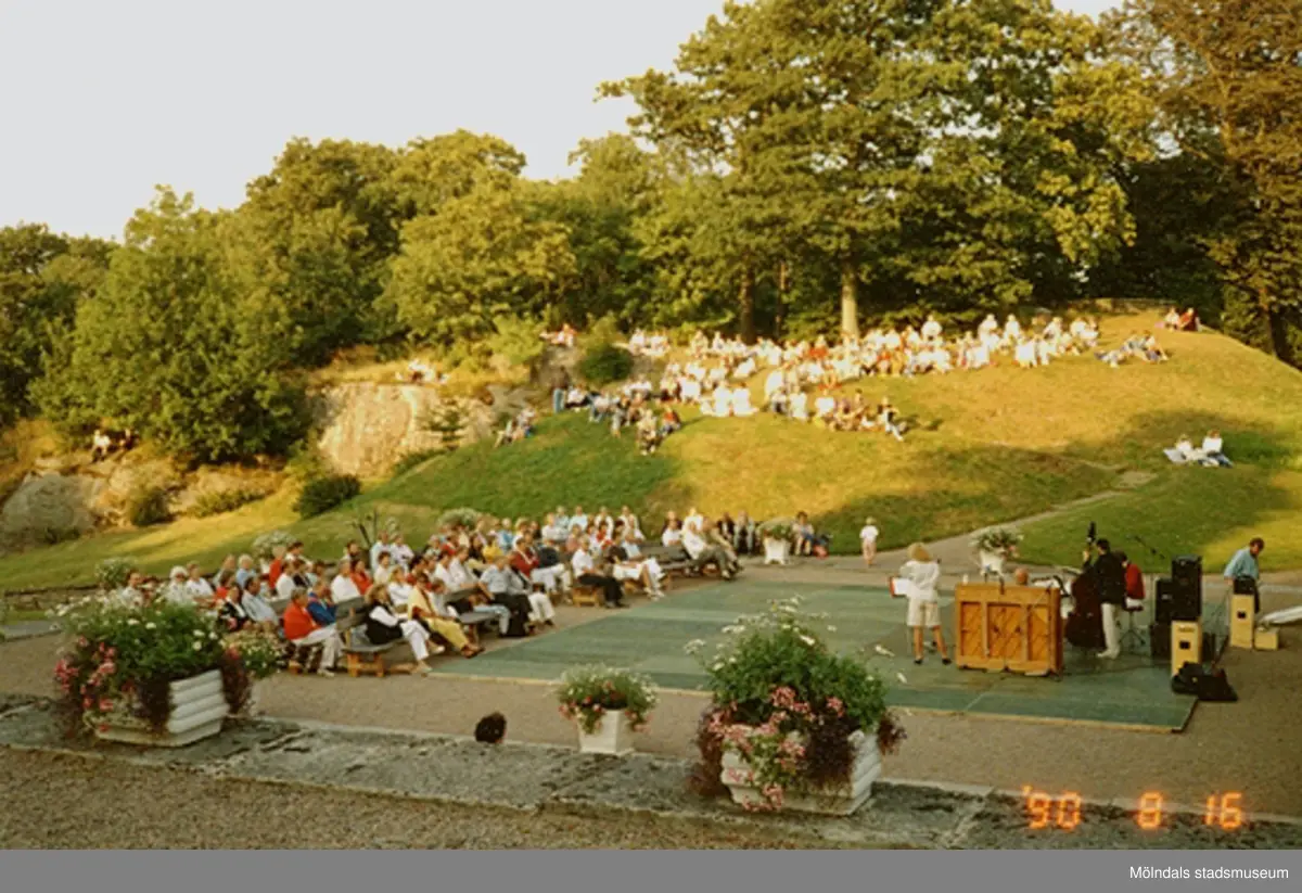 Publik som lyssnar till en pianokonsert sitter både på kullen samt uppställda bänkar. Gunnebo slotts framsida, augusti 1990.