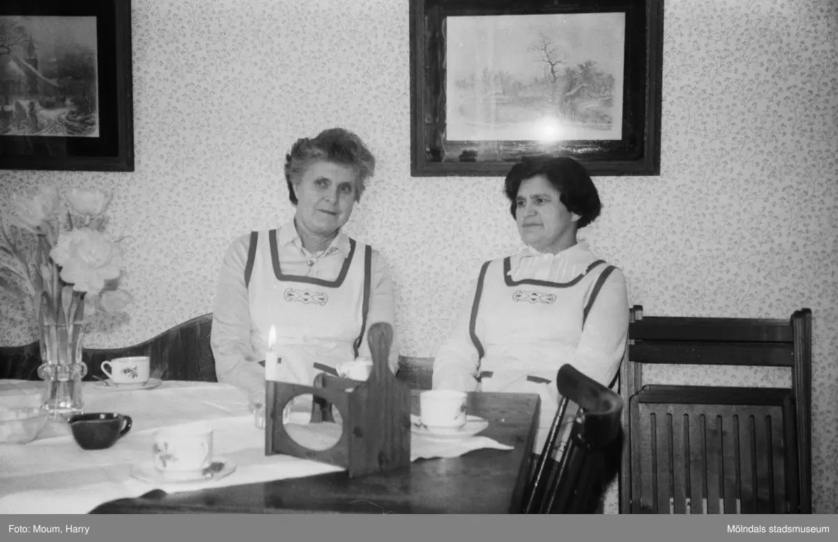 Från vänster: Lily Edvardsson och Dagmar Svensson (båda från Kållered) sitter och fikar på hembygdsgården i Långåker, Kållered år 1983.
