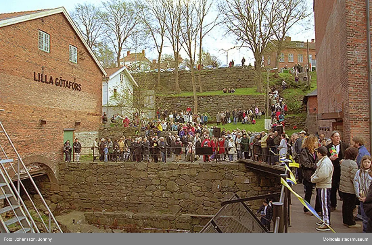 Kvarnbydagen 28 april 2002. Åskådare står utanför Lilla Götafors och har nyss sett invigningen av Royens spång. Till höger ses Stora Götafors.