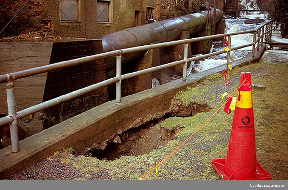 Dokumenterad markskada. Grop i marken vid Mölndalsforsens strandbank från södra sidan vid Stora Götafors. En röd kon samt ett flaggförsett band markerar raset. Oktober 1998 - januari 1999. Relaterat motiv: 2002_0924.
