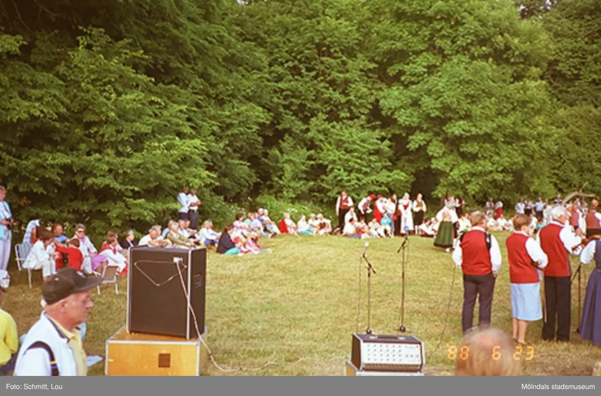 Människor som sitter eller står i en cirkel på en gräsmatta. Samtliga är klädda i folkdräkt och de tittar på folkdans som pågår utomhus vid Gunnebo slott.