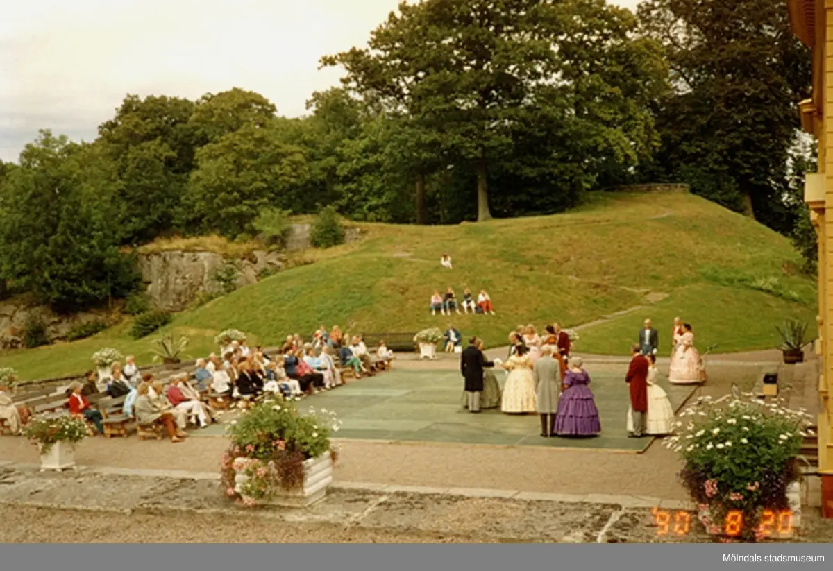 Dansuppvisning framför Gunnebo slott, med dansare i kläder från 1800-talets förra del. 20 augusti 1990. Fler relaterande bilder finns.