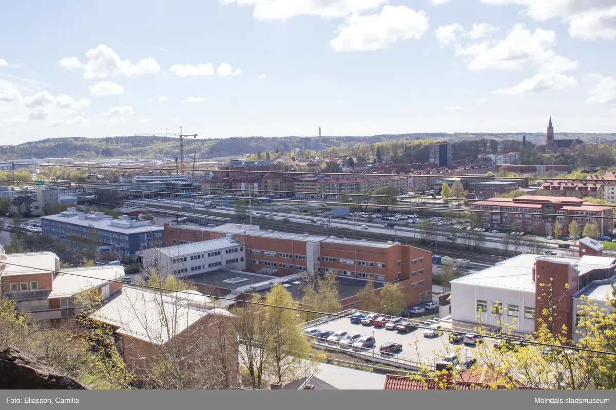 Utsikt från stadsdelen Trädgården i nordost mot Mölndalsbro i sydväst. Vägen strax nedanför är Torggatan. I mitten ligger det röda tegelhuset som är både Polishus och Passexpedition. Mittemot ligger bostadsområdet Timmermannen på Torggatan 64. I fonden ser man Mölndals stad breda ut sig över de tidigare ängsmarkerna. Byggkranen står placerad mitt i SCAs nya kontorsbyggnad vid Mölndals bro. Riskullaverkets skorsten syns långt bort, mitt i bild och Fässbergs kyrka tronar på sin höjd.