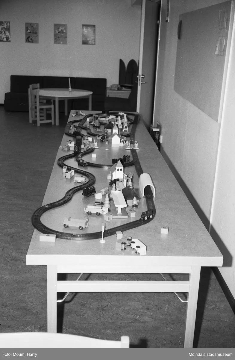 Apelgårdens kyrka i Kållered, år 1983. Lekhörna med modelljärnväg.