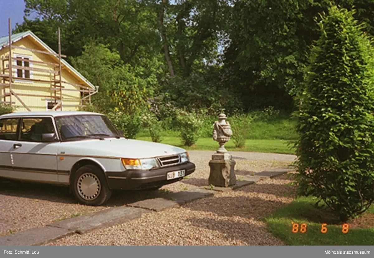 En vit Saab står parkerad framför en blomsterurna vid Gunnebo slott.