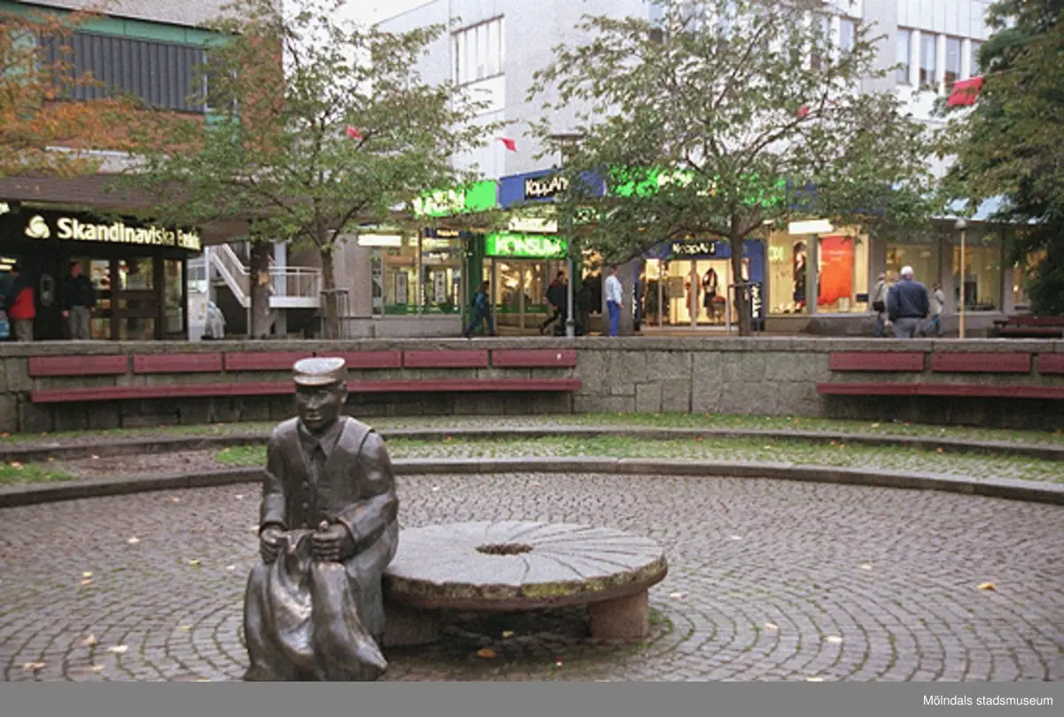 Alberts torg/Mölndals torg år 1996. Mölndalsbro i dag - ett skolpedagogiskt dokumentationsprojekt på Mölndals museum under oktober 1996. 1996_1135-1152 är gjorda av högstadieelever från Kvarnbyskolan 9D, grupp 1. Se även 1996_0913-0940, gruppbilder på klasserna 1996_1382-1405 samt bilder från den färdiga utställningen 1996_1358-1381.