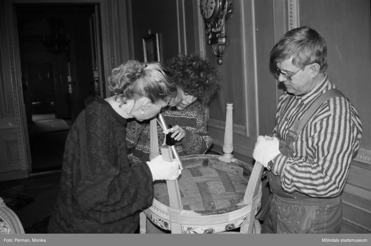 Antikvarisk storstädning på Gunnebo slott 1992. En kvinna och teknikern Alf Garthman inspekterar undersidan av en stolsits.