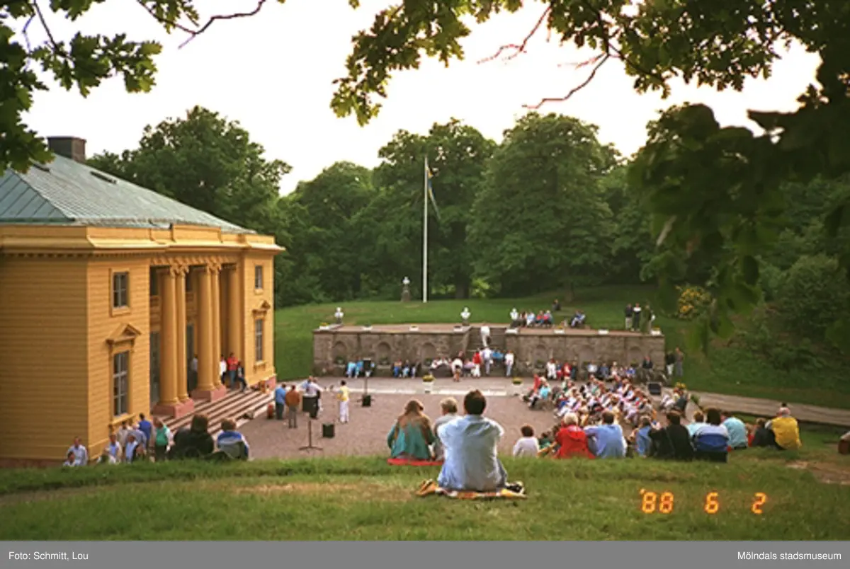 Människor som sitter och tittar på ett musik- och teateruppträdande på Gunnebo slotts framsida.