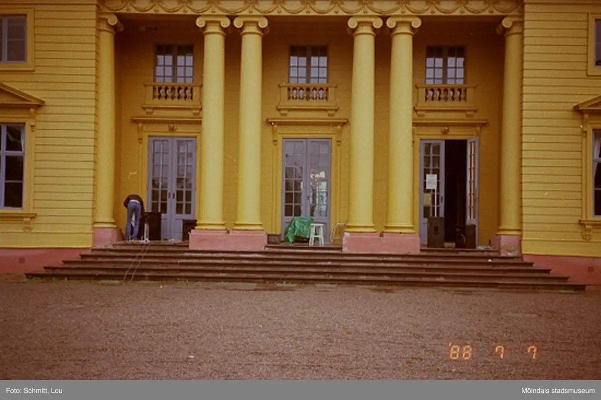 En man, med ryggen vänd åt fotografen, står på trappan till Gunnebo slottsentré. Mannen fixar med en anläggning inför en teaterföreställning. Man ser en del av grusplanen samt en bänk.