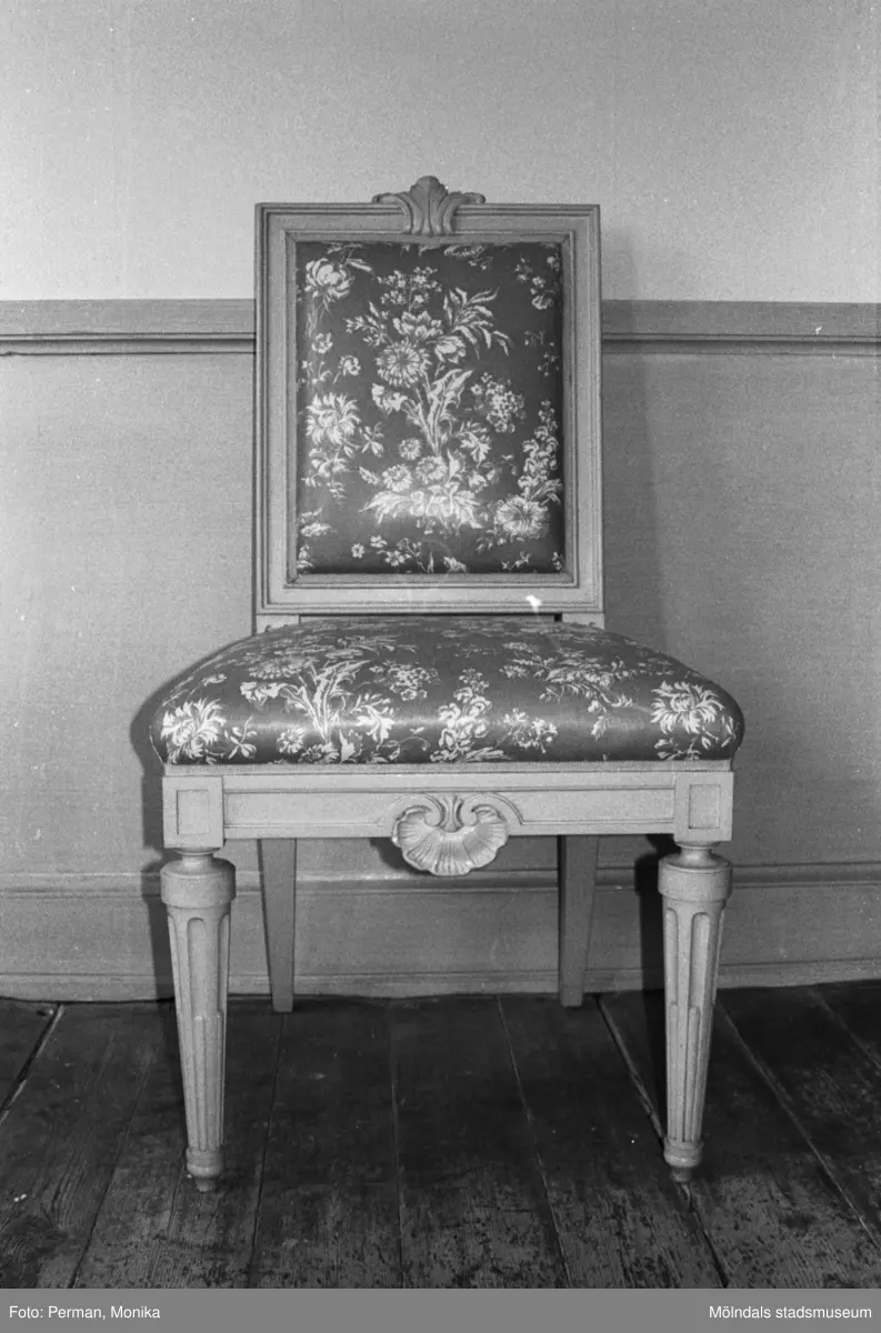 Antikvarisk storstädning på Gunnebo slott 1992. En stol som står vid en väggpanel.