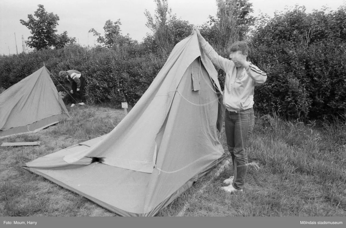 Åby camping i Mölndal tar emot sina första campare, år 1984. "Fyra norrmän blev de första att slå upp tältpinnarna vid Åby nya camping. Vad passar bättre än att en norrman fotograferade?"