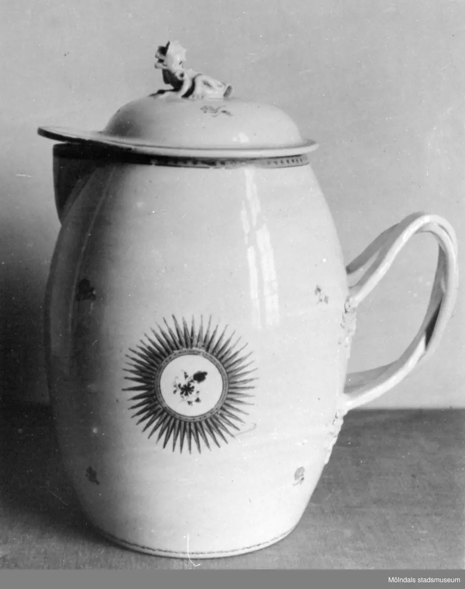Dekormålad tillbringare i porslin med lock. Gunnebo slott 1930-tal.