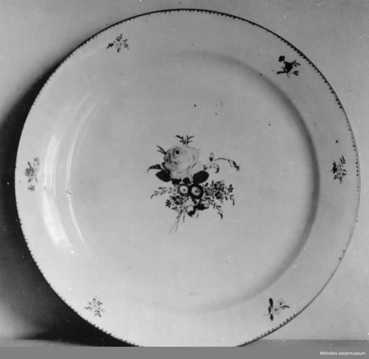 Porslinstallrik, dekormålad och ståendes utmed en vägg. Gunnebo slott 1930-tal.