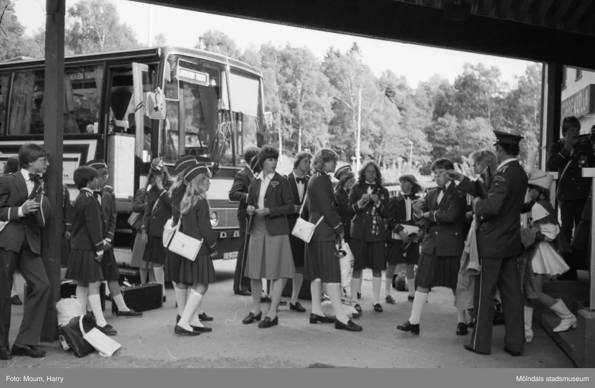 Titel: Norska skolorkestern Åsgårdens skolekorps vid Torrekulla turiststation i Kållered, år 1983. För mer information om bilden se under tilläggsinformation.