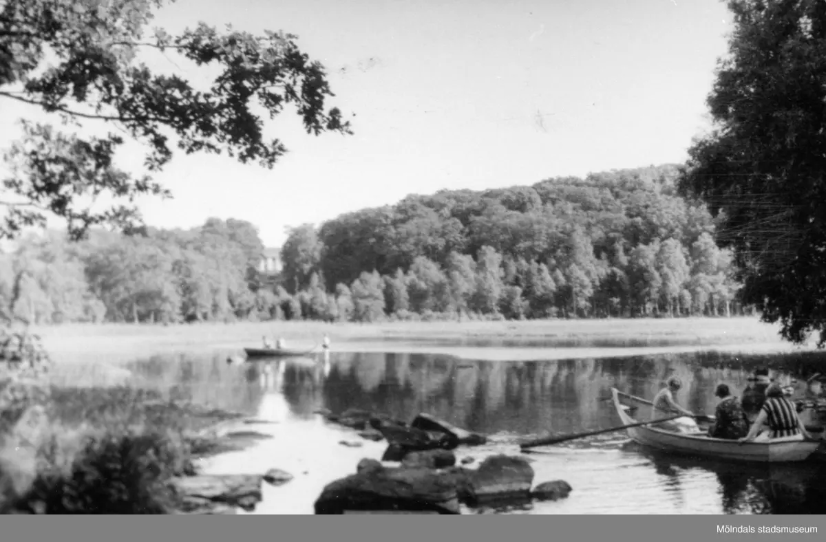 Vy över Stensjön, 1920-30-tal. Personer som ror ekor och en person som står i vattnet. I bakgrunden skymtas Gunnebo slott.