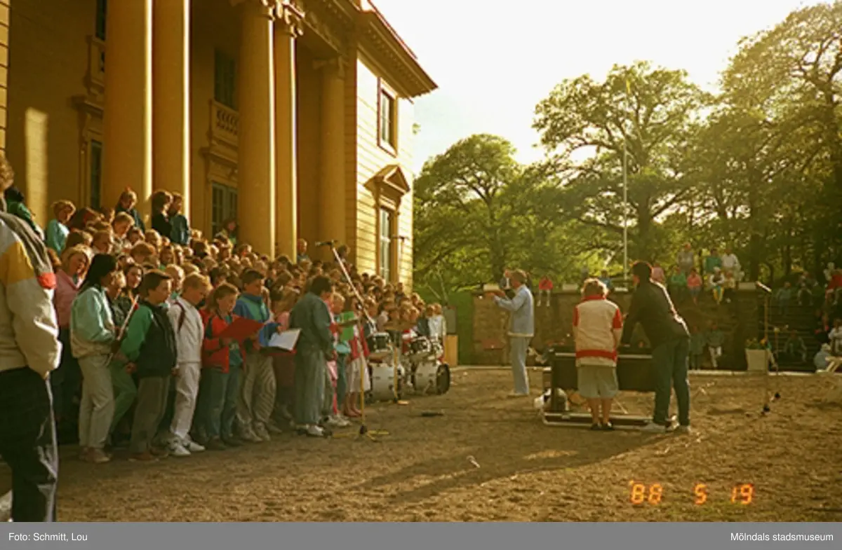 En barnkör som sjunger på framsidan av Gunnebo slott. Framför barnen står en kör-ledare samt ett par som spelar el-orgel.