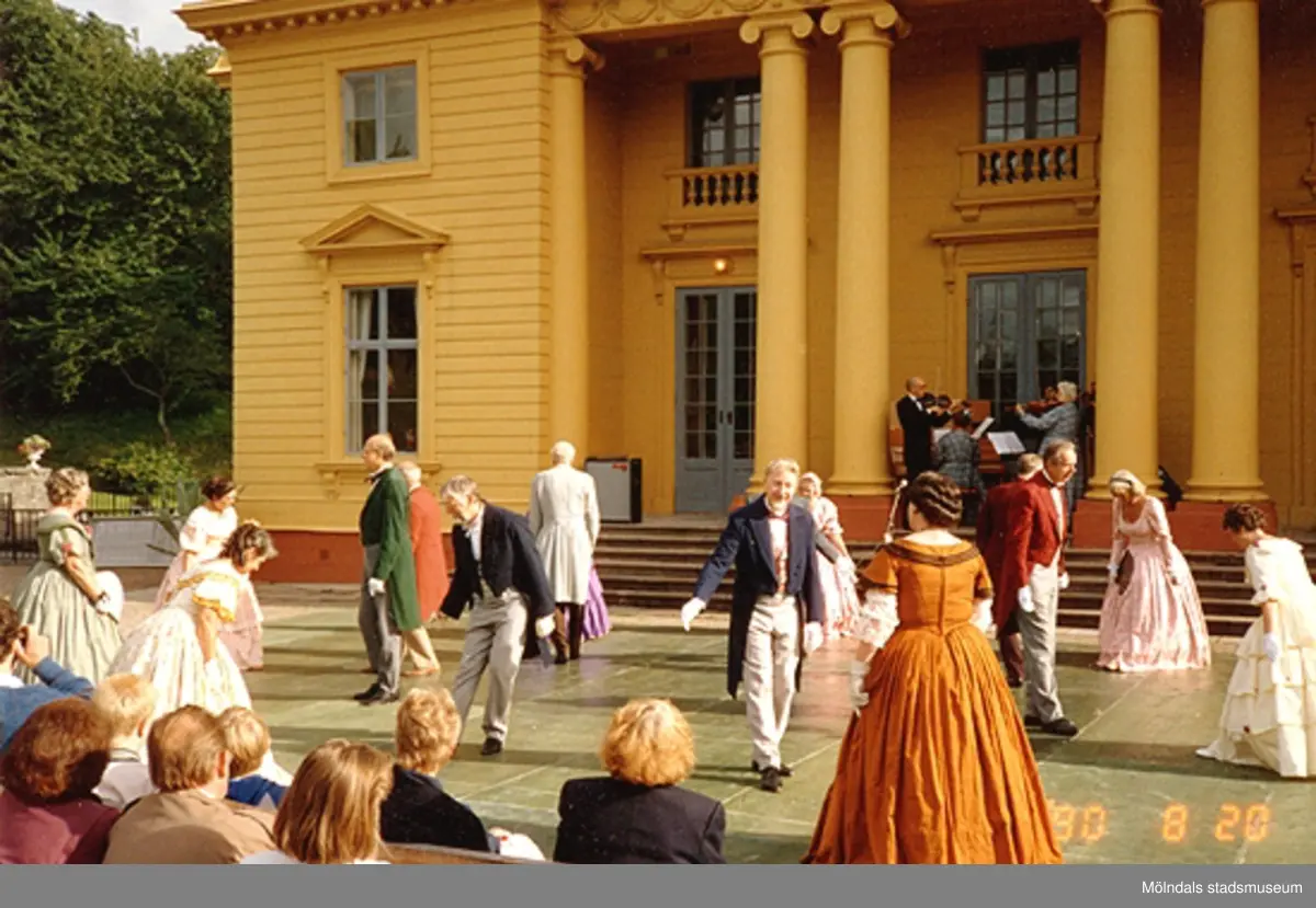 Dansuppvisning framför Gunnebo slott, med dansare i kläder från 1800-talets förra del. 20 augusti 1990. Fler relaterande bilder finns.