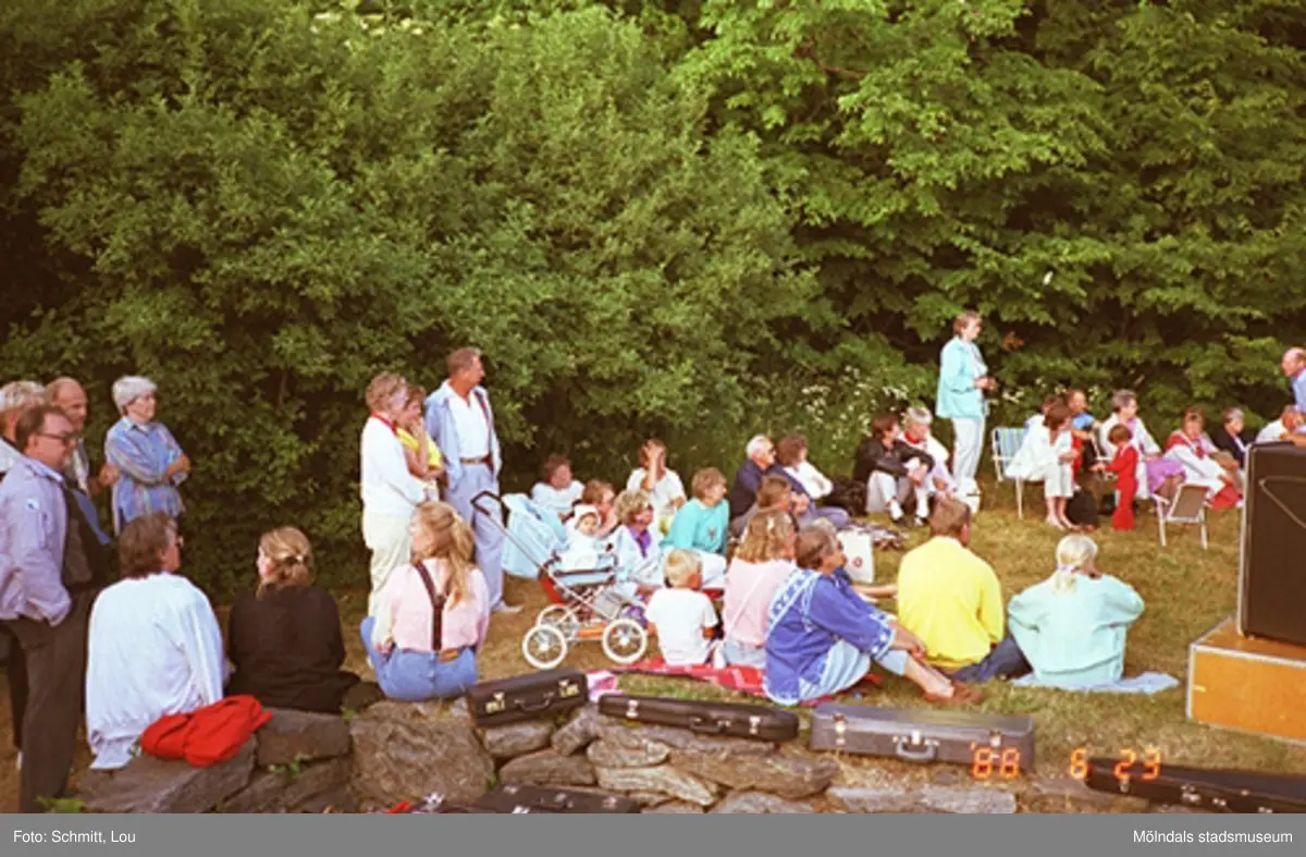 Människor som tittar på folkdans i parken vid Gunnebo slott. De sitter och står bl.a på en stenmur.
