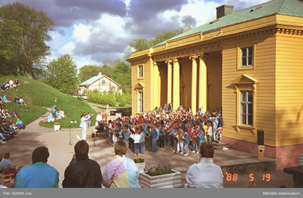 Föreställning med flertalet barn som spelar och sjunger. De står på trappan till Gunnebo slotts framsida. På grusplanen framför står eller sitter människor och ser på.