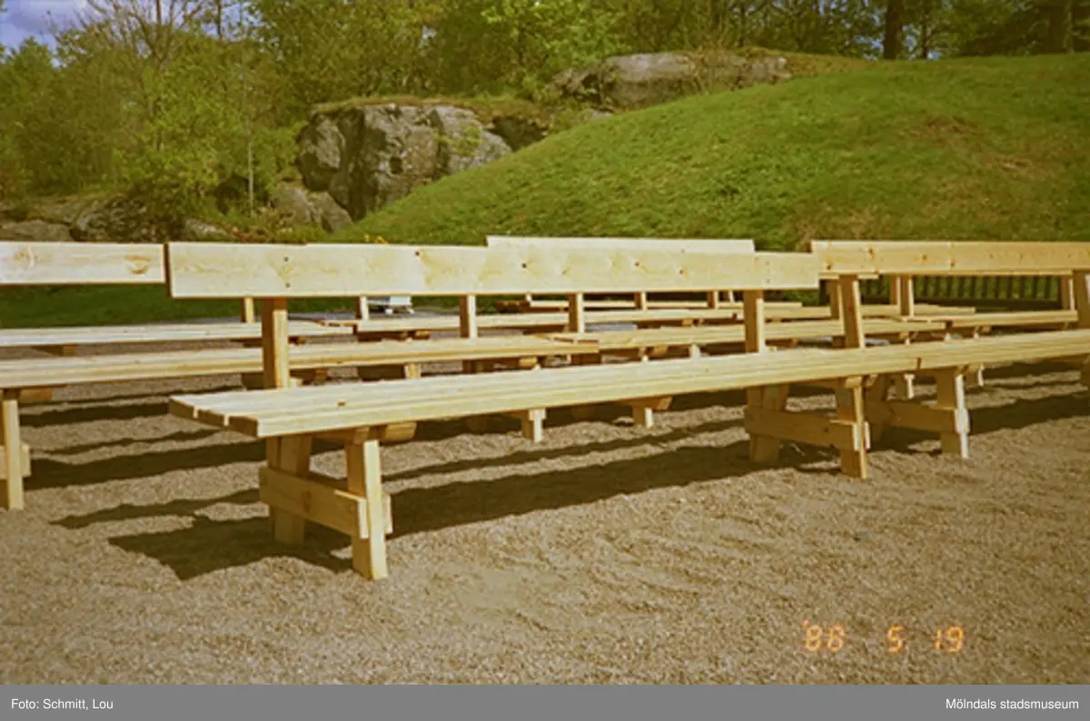 Några träbänkar som står på grusplanen framför Gunnebo slott.