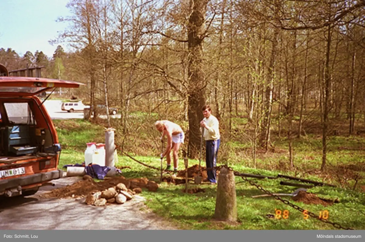 Två män som gräver vid sidan av vägen, som går från "Runde sten" på John Halls väg, upp mot Gunnebo slott. Stora stenar har grävts upp och ligger nu på marken. Till vänster står deras bil.