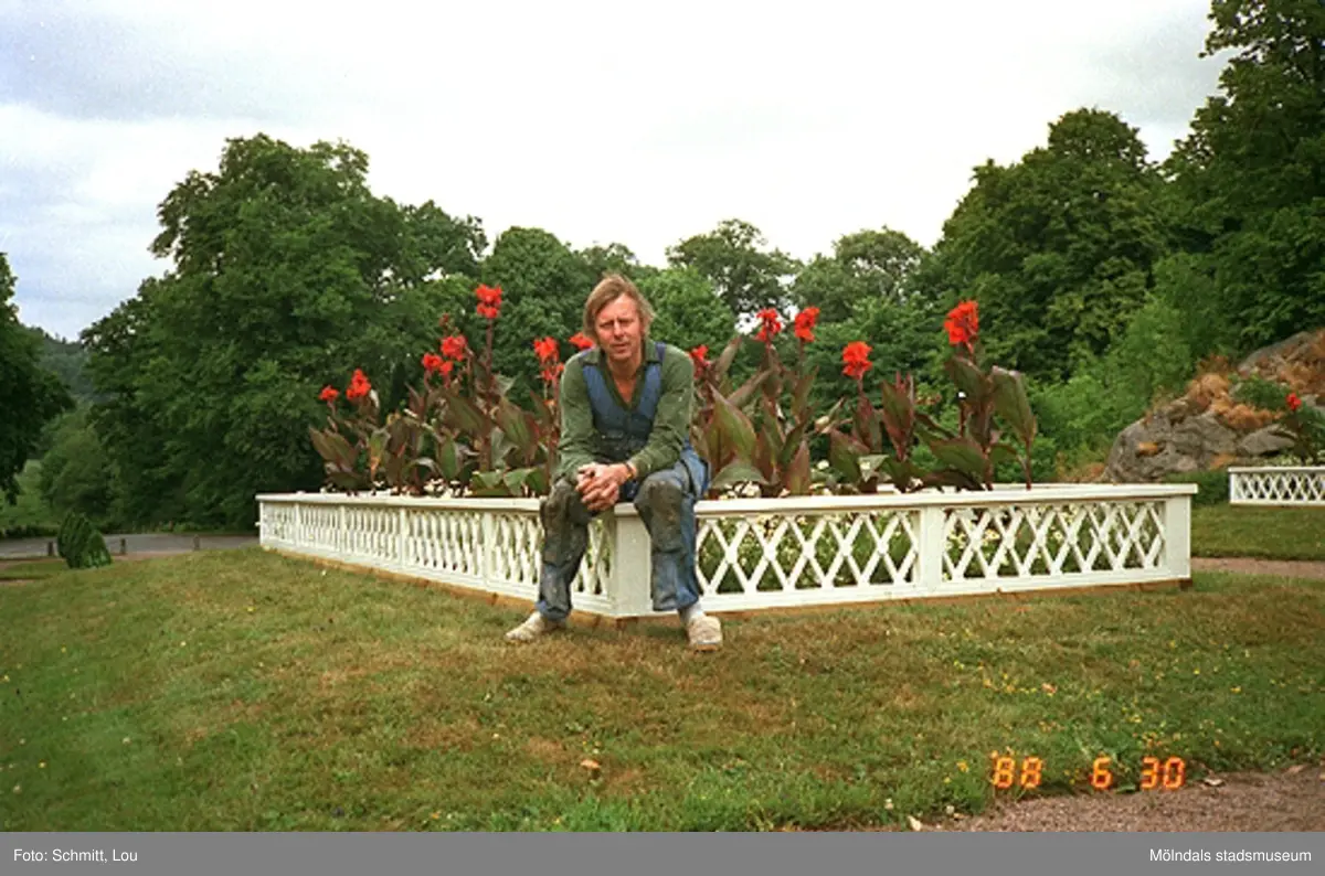 En man tittar mot fotografen i Gunnebo slottspark. Han sitter på ett vitt, lågt staket vid en blomsterrabatt. I bakgrunden ser man flera träd.