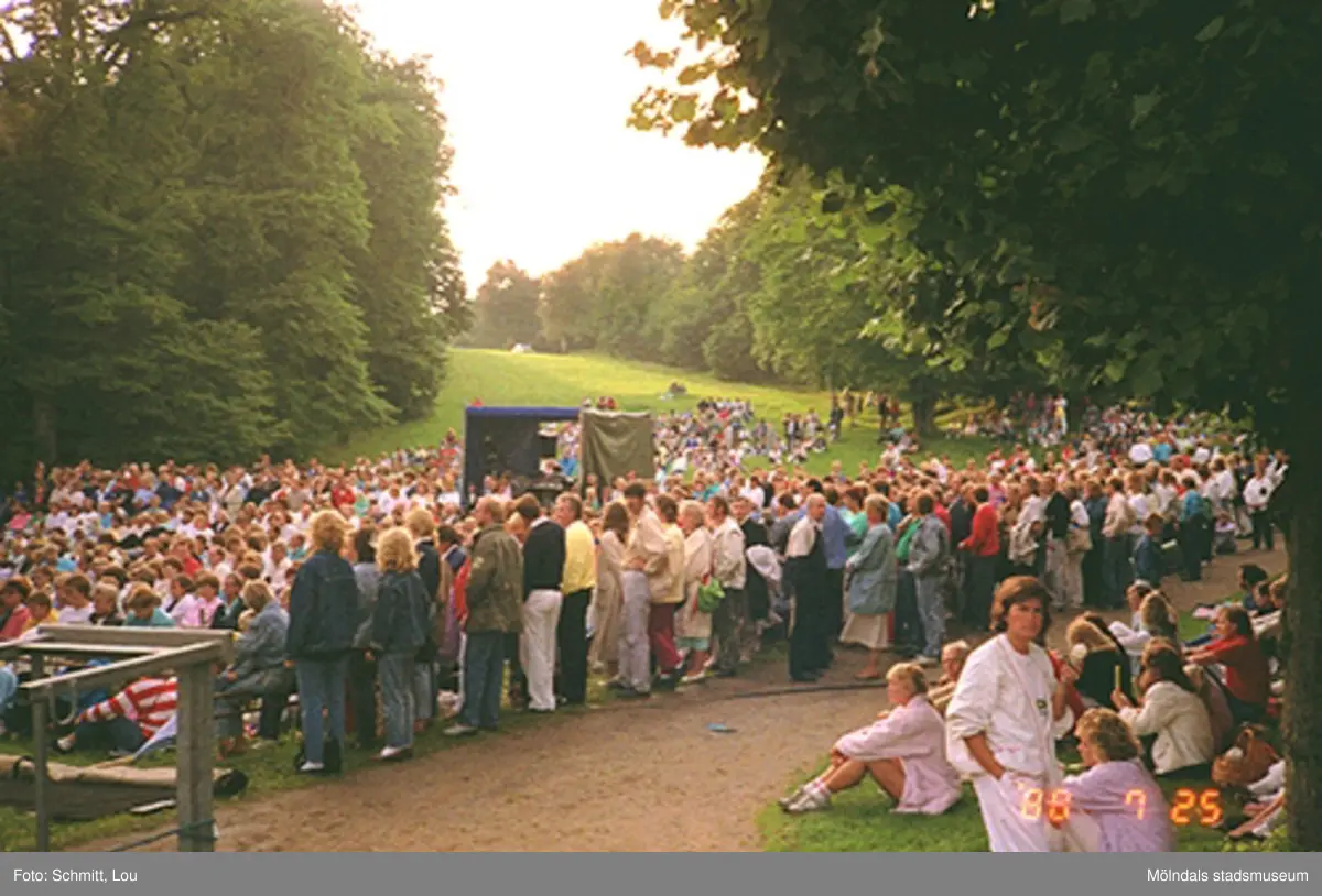 Publik under musikarrangemang i parken vid Gunnebo slott.