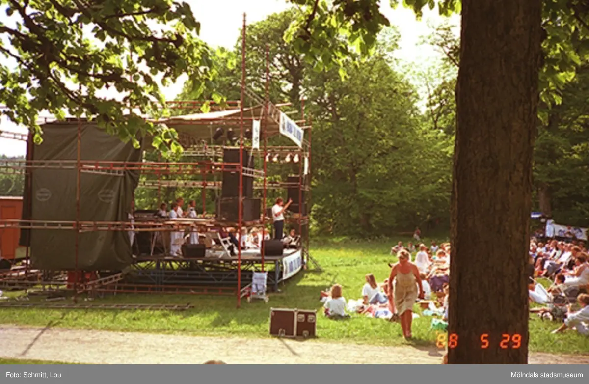 Människor sitter på gräset och lyssnar till Lasse Berghagen, som sjunger på en tillfälligt uppbygd scen på Gunnebo slotts baksida, 29 maj 1988.