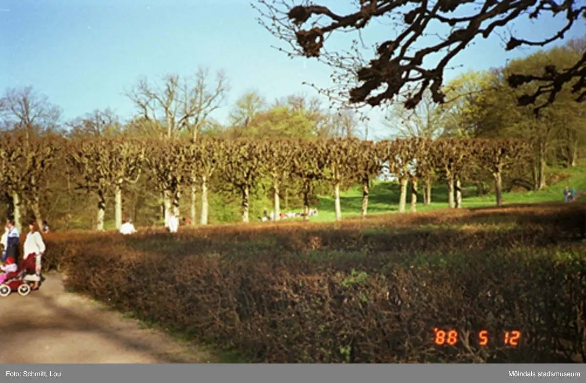 En häck i Gunnebo slottspark. Några människor står längre fram utmed häcken. I bakgrunden ser man en allé med välklippta träd och gräsmattor.