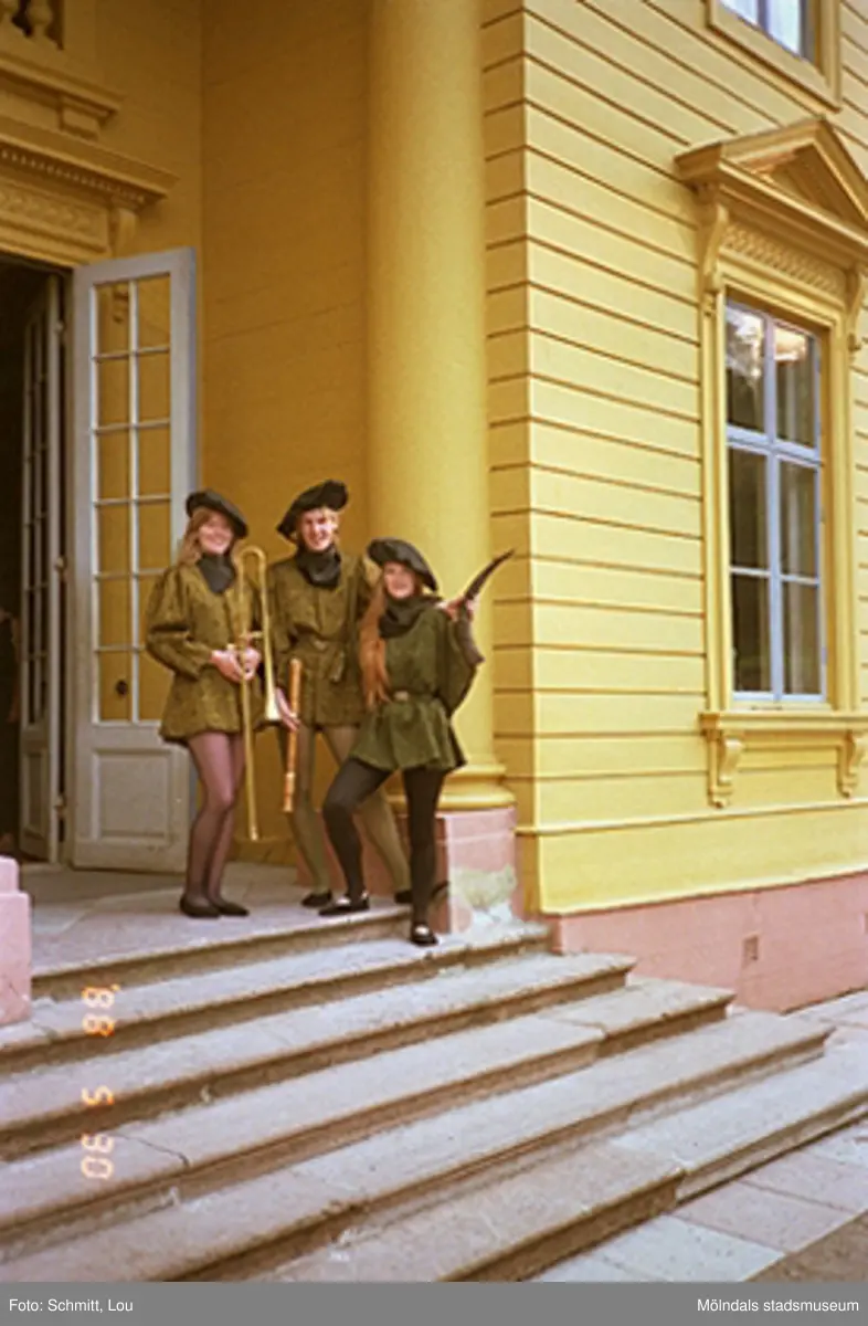 Tre personer med musikinstrument, iklädda historiserande dräkter, står utanför huvudentrén till Gunnebo slott.