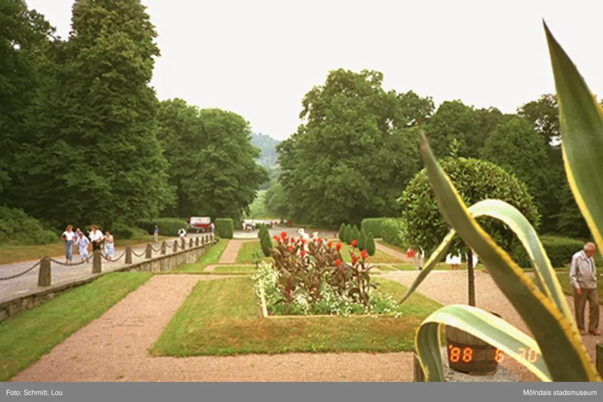 Gunnebo slotts framsida. Man ser växtlighet och en del av parken. Människor går på vägen som leder upp mot slottet.