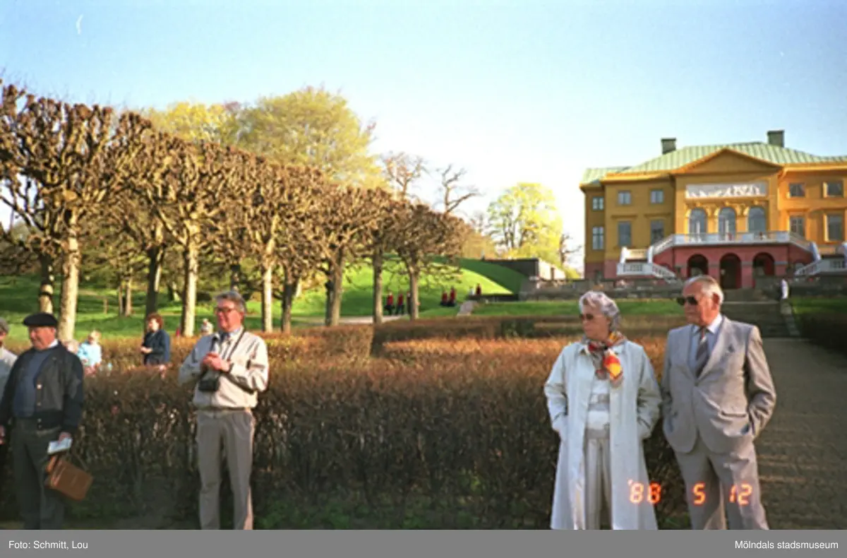 Några människor som står och lyssnar/tittar på en studentkör i Gunnebo slottspark. I bakgrunden ser man en rad av ansade träd samt slottet.